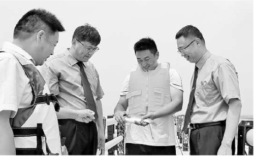 近日,江苏省东海县检察院邀请县政协委员樊振(左一)来到该省最大水库石梁河水库,开展水环境综合整治“回头看”活动。图为养殖户在介绍“以水养鱼、以鱼净水”大水体自然生态养殖模式。 本报通讯员王春明摄