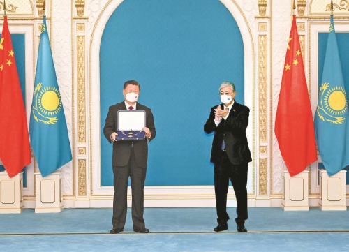 托卡耶夫致授勋辞。托卡耶夫表示,今天,伟大的中国国家主席习近平访问哈萨克斯坦,是哈方的莫大荣幸。习近平主席是一位真正的伟大领袖,得到中国人民的衷心拥护。在习近平主席卓越领导下,中国取得伟大发展成就,消除了绝对贫困,全面建成了小康社会,中华民族伟大复兴进入新征程。相信在习近平主席英明领导下,中国必将如期实现全面建设社会主义现代化国家的宏伟目标。习近平主席提出共建“一带一路”和构建人类命运共同体的伟大倡议,为推动建设新型国际关系作出杰出贡献。习近平主席提出的全球发展倡议和全球安全倡议,对于解决当今世界面临的风险挑战具有重要战略意义。