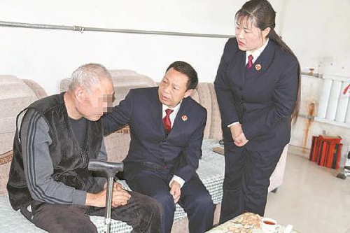 图为检察官来到徐某家中,将司法救助金送到徐某手中。