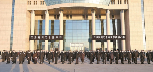 北京西郊机场国旗半垂,气氛庄严肃穆,黑底白字横幅上写着:“江泽民同志永垂不朽”“江泽民同志永远活在我们心中”。习近平和夫人彭丽媛等胸佩白花、臂戴黑纱,神情凝重地在停机坪肃立。