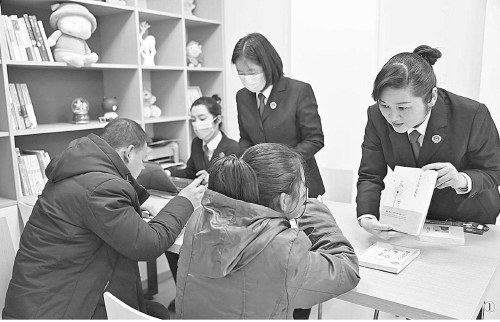 图①:“蓝纸鹤”团队检察官对被害人及家属进行心理辅导。