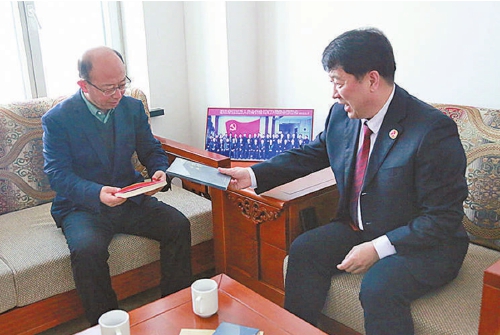 赵文龙(左)与安达市检察院检察长刘东润交流,并就检察工作提出意见建议。