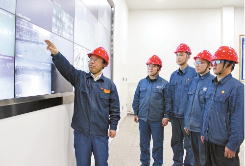 赵文龙(左一)深入中文化工有限公司,为操作人员讲解优化生产操作流程的方法。