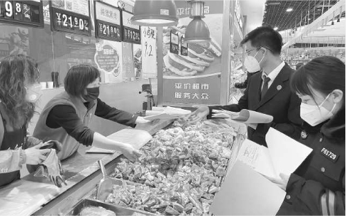 日前,陕西省府谷县检察院干警推动市场监管部门工作人员对商超、市场等地的商品安全情况开展走访调查,并向商户宣讲保障食品安全法律知识。 本报记者倪建军 通讯员韩普摄