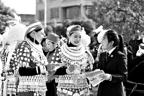 近日,贵州省黄平县谷陇镇举行“最美苗乡”系列民俗活动,上万名群众到此欢聚。黄平县检察院选派少数民族干警,用少数民族语言和汉语向当地群众开展“双语”普法宣传。检察干警通过发放宣传手册、答疑解惑等方式向当地群众讲解非法集资犯罪活动的特征、表现形式、常见手段,提升群众防范非法集资意识。 本报通讯员王超 田凯丽摄