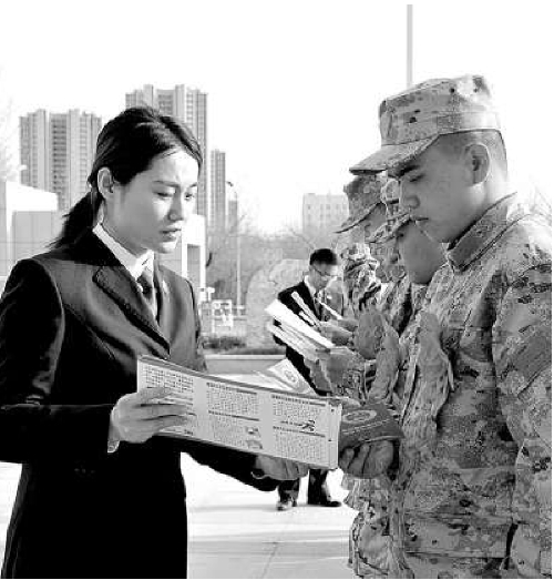 检察官向入伍新兵发放防范电信网络诈骗宣传手册。