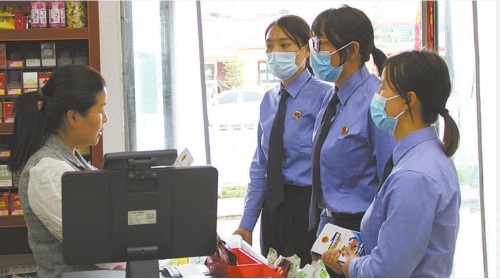 2023年10月9日,王小婷(右二)和同事们一起来到刚察县沙柳河镇民族寄宿制小学周边商铺,摸排涉未成年人公益诉讼线索。