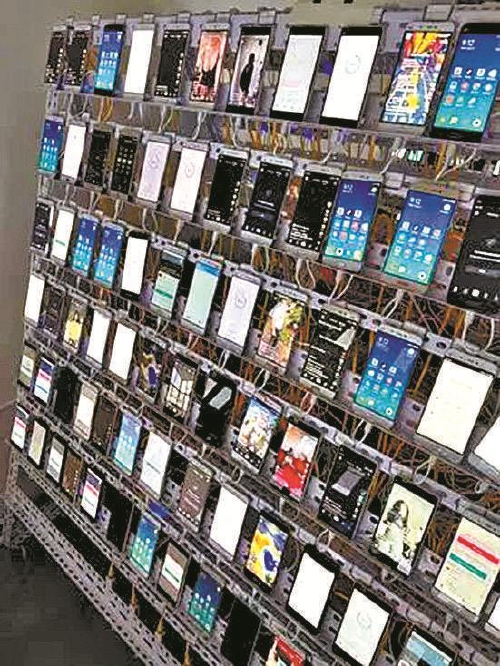 浙江省宁波市鄞州区检察院办理的一起非法经营案中,王某搭建群控机房,可以同时控制上千台设备同时进入直播间充流。图为机房中密密麻麻地排列着多部手机一同“工作”。 (图片由鄞州区检察院提供)