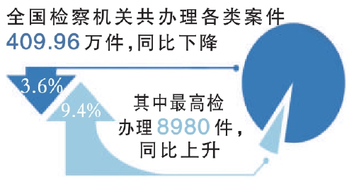 最高检工作报告指出,全国检察机关共办理各类案件409.96万件,其中最高检办理8980件,同比分别下降3.6%和上升9.4%。