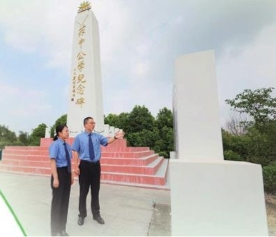 江苏省宝应县检察院检察官实地查看苏中公学纪念碑修复情况。