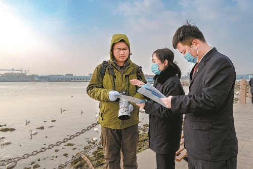 新春来临,山东省荣成市检察院启动争当“白色精灵”守护人——大天鹅保护专项监督活动,组织人员前往荣成大天鹅国家级自然保护区走访调研,并对前来参观的游客开展普法宣传,图为检察人员向摄影爱好者发放保护天鹅宣传资料。 本报记者卢金增摄