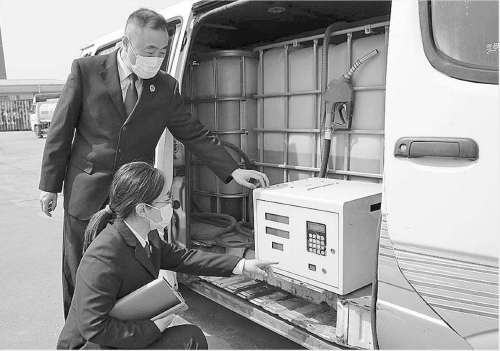 近日,江苏省南通市崇川区检察院干警对辖区非法流动加油车整治情况进行“回头看”。图为检察官在非法流动加油车暂扣现场调研非法流动加油设施情况。 本报通讯员沈媛媛 包学红摄