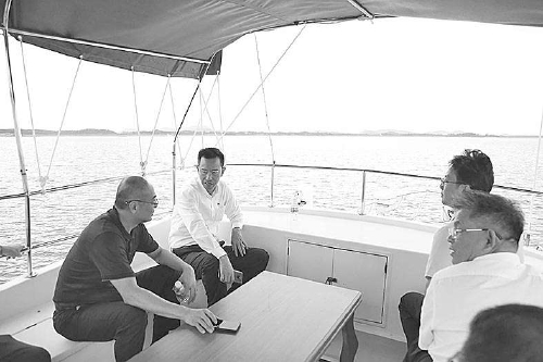 2020年7月,湛江市检察院检察长张和林(左二)与廉江市市长庞晓冬(左一)开展巡河工作,助推鹤地水库生态整治。 资料图