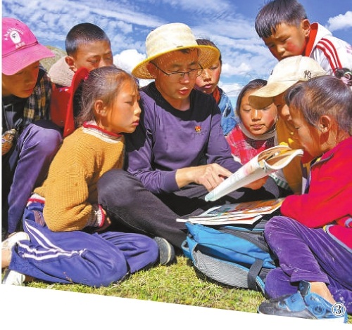 图③:日前,青海省果洛藏族自治州检察院派驻班玛县吉卡乡贡章村第一书记邢生旺组织驻村工作队队员为牧区学生送来一堂生动法治课。 本报记者李维 王丽坤 通讯员才周摄