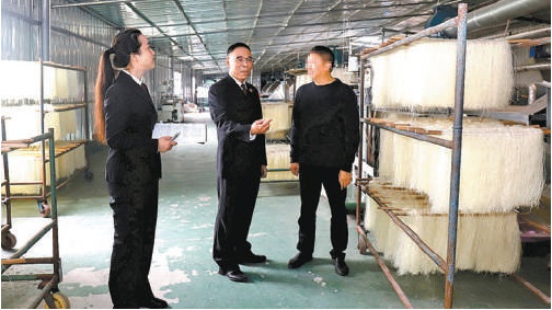 潘朗(中)和刘用玲走访甲公司,了解公司经营情况,并向公司负责人释法说理。