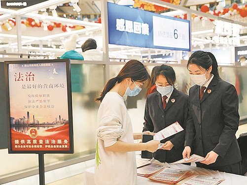 近日,河北省唐山市路南区检察院检察官来到核心商圈,开展“党建引领聚合力 营商环境再优化”主题党日活动。检察官现场开展法治宣传活动,用党建“触点”联动优化法治营商环境建设。 本报通讯员于淼摄