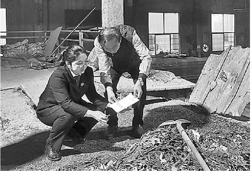 我们让铁簸箕的敞口搁置在铁墩子上,工人的站位和具体的行为都尽可能还原案发时的现状。当空的铁簸箕被慢慢抬高时,我弯腰去搬铁墩子,结果费了好一番力气才将铁墩子搬了出来。
