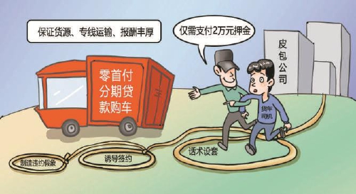 “我看公司挺正规的,这个经理也很专业,最关键的是,这个工资待遇算是很高的了,所以我立即就签了合同。”小范回忆说。签约后,根据公司要求,小范先交纳了一大笔押金。原来,想要赚这份“高薪”,首先要根据签约年限交给公司一笔1万元至2万元不等的押金。由于小范没有自己的货车,张经理便要求他交纳2万元的押金,随后帮他联系4S店零首付分期贷款购买车辆,并承诺小范“如果以后不再跑物流,随时可以把车子过户到公司名下,不再还贷”。