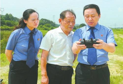 湖北省黄梅县检察院检察官邀请陈燎原(中)对涉案河道整治情况进行“回头看”。