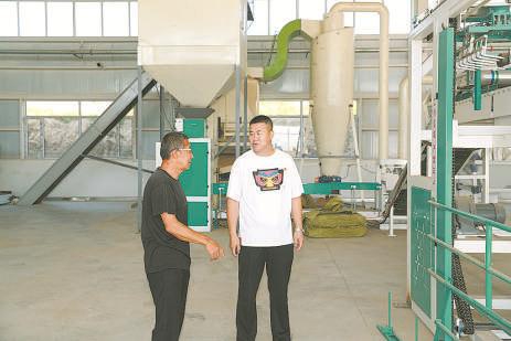 薛志龙(右)到柠条饲料加工厂了解生产情况。