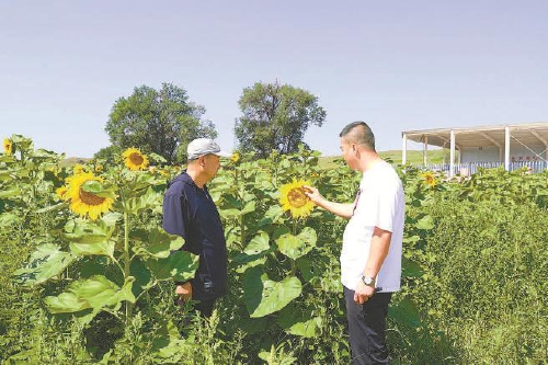 薛志龙(右)和村民一起查看向日葵生长情况。