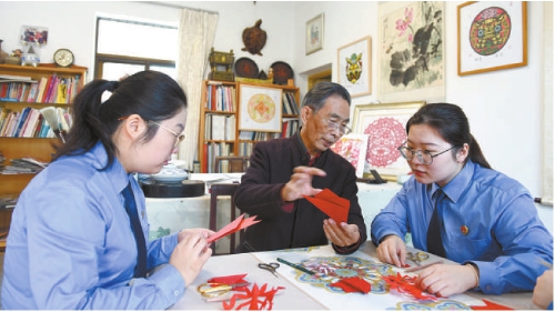近日,江苏省金湖县检察院公益诉讼检察官走访江苏省非遗项目金湖剪纸传承人陆功勋,通过交流探访了解金湖剪纸保护传承,挖掘检察公益诉讼助力非遗传承发展的新路径。 本报通讯员顾善俊 杨蕙咛摄