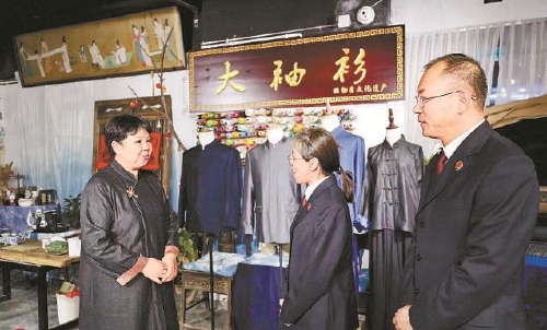 今年10月,洛阳市瀍河回族区检察院检察官走访大袖衫非遗传承人张志晓(左)。 《方圆》记者张哲摄