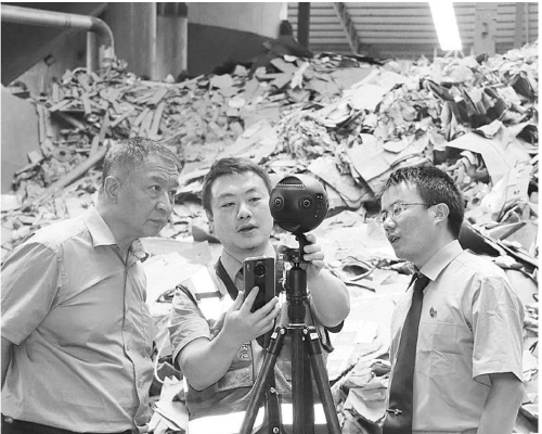 在涉案纸业公司内,云南省昆明市西山区检察院检察官通过“昆检慧视”3D全景影像辅助现场勘验。