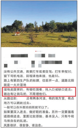 “坐半天车就只能看到一个全景,票还老贵”。在不少劝退、避雷该景区的网帖中,小露看到了其他网友发布的“免费湿地景观”旅游攻略帖,“有一个免费看湿地的地方,在第四生产队,里面比较原始,基本没人,很治愈”。在参考多篇攻略帖的建议后,小露决定规避上述正规湿地景区,去“更美、免费”的野湿地。