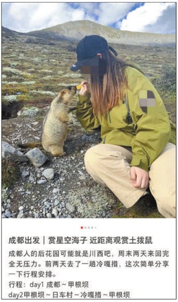 然而,当记者在小红书、马蜂窝等平台搜索“土拨鼠”关键词时,却仍有多位博主晒出照片、分享攻略帖,推荐网友在景区与土拨鼠接触,“油光水滑,手感很好”“带士力架更会受到鼠鼠青睐哦”。