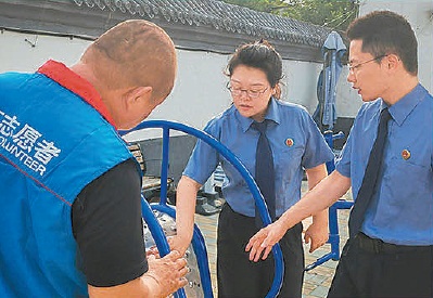 郭琦(中)与检察官和公益诉讼志愿者对健身器材维修更换情况进行“回头看”。