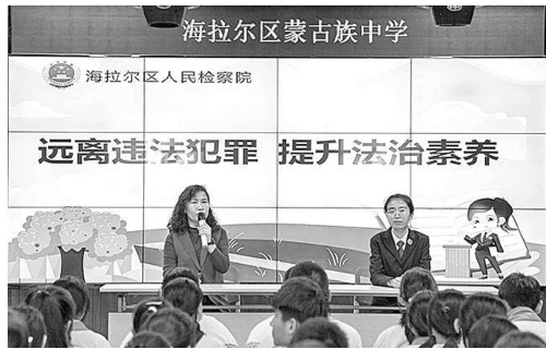 呼伦贝尔市海拉尔区检察院“青苗未检”团队检察官在辖区一所中学开展未成年人网络安全教育。