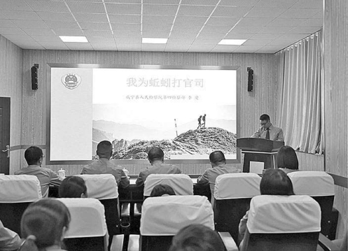 威宁县检察院组织开展“透过业务看政治讲忠诚”案件集中讲评活动。图为检察官李爱在讲述办理电捕野生蚯蚓案经验。 徐冉/摄