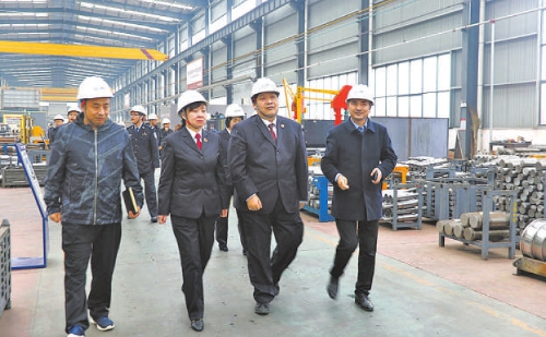 新乡市卫滨区检察院检察长李新领(左二)深入企业走访问需,调研了解企业知识产权保护情况并现场解决问题。