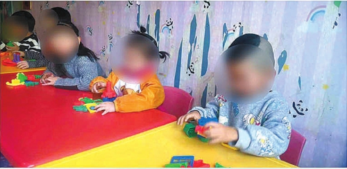小正(右一)在幼儿园和小朋友们一起玩玩具。