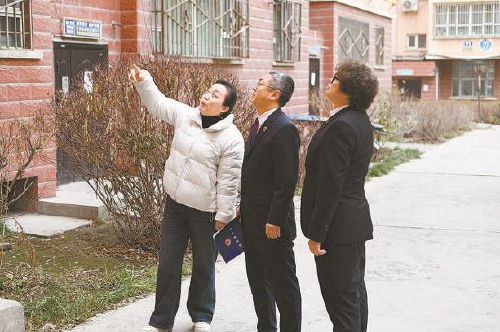人民监督员艾忠江(右)与新疆维吾尔自治区乌鲁木齐市沙依巴克区检察院检察官对涉案小区进行“回头看”。