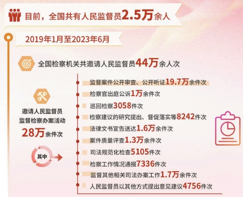 数据显示,目前,全国共有人民监督员2.5万余人。2019年1月至2023年6月,全国检察机关共邀请人民监督员44万余人次,监督检察办案活动28万余件次。人民监督员制度的效能正在蓬勃的实践中不断被释放。