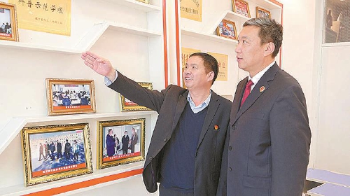 马建国(左)在向前来调研的黑龙江省检察院大兴安岭分院检察长刘兆达展示学校的荣誉墙。