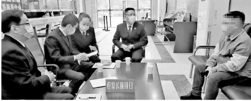 2023年4月,福建省明溪县检察院检察长胡世棋(左一)接待信访群众,倾听群众诉求。