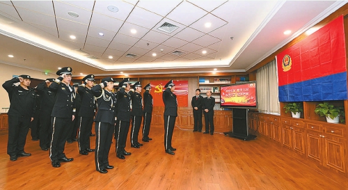 1月9日,为纪念第四个中国人民警察节,北京市朝阳区检察院全体司法警察面向警旗,重温习近平总书记训词精神,凝神静气,学思践悟,努力以司法警察高质量发展服务检察事业现代化。