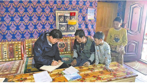 2023年10月14日,达日县检察院检察长尕藏多杰(左一)到牧民家中调研。