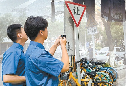 2023年5月,检察官在校园周边查看交通标志设置情况。