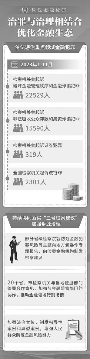 “我们坚持治罪与治理相结合,优化金融生态。持续协同落实‘三号检察建议’,结合办案加强诉源治理。”张晓津说,过去一年,部分省级检察院就防范金融犯罪风险等主题向地方党委作专题报告,向涉案金融机构制发检察建议;最高检驻中国证监会检察室发挥“驻”的优势,20个省、市检察机关与当地证监部门签署合作意见;各级检察机关加强与金融监管部门的协作,推动金融领域行刑衔接。
