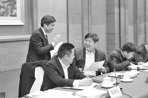 安徽省淮北市检察院检察长李大伟(站立者)向淮北团省人大代表呈送答复函。