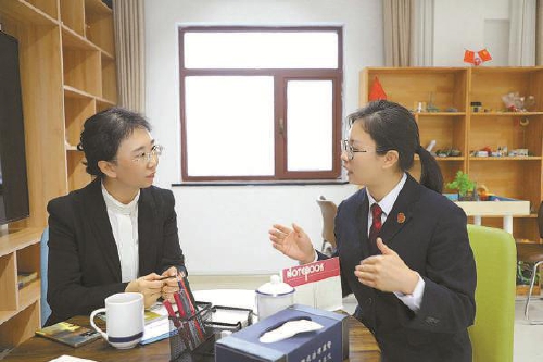 2023年11月,陈爱雪受邀调研内蒙古自治区通辽市检察院有关工作。图为陈爱雪(左)听取检察人员介绍该院公益诉讼检察工作。