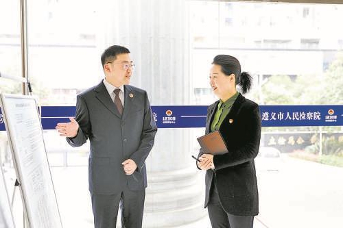 3月20日,刚从全国两会履职归来的李英(右)来到遵义市检察院宣讲全国两会精神,对公益诉讼检察工作开展调研。