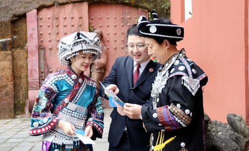 近日,全国人大代表张琼丽(左)和湖北省恩施市检察院检察官在旅游景区土司城一同开展反诈普法宣传,向游客和当地商户发放讲解普法手册。 本报记者戴小巍 通讯员焦雯雯摄