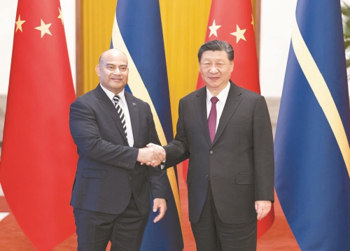 习近平强调,平等待人是中国外交的鲜明品格。中方始终主张,国家不分大小、强弱、贫富,都是国际社会平等的一员。中国始终是发展中国家一员,中国在联合国安理会的这一票永远属于发展中国家。中瑙关系是彼此尊重、平等互惠、相互支持的关系。中方坚定支持瑙鲁维护国家主权、安全、发展利益,坚定支持瑙鲁独立自主走符合本国国情的发展道路,愿同瑙方加强各层级、各领域交流对话,不断增进相互理解和信任,夯实两国关系的政治基础。