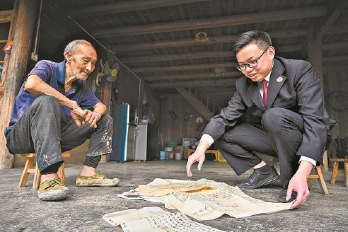 锦屏文书是贵州清水江流域苗族侗族人民创造和保藏的一种民间文献遗产,主要是山林经营和木材贸易方面的民间契约和交易记录,2010年2月被列入《中国档案文献遗产名录》。图为近日贵州省锦屏县检察院检察官来到辖区村寨开展文化遗产保护法治宣传,引导锦屏文书民间收集者配合档案馆开展文书收集工作,加强文书保护。 本报记者丁艳红 通讯员王超摄