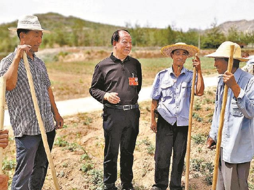 侯二河(左二)深入田间地头向村民宣讲惠民政策。